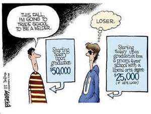 A high school's primary success indicator should not be how many of its graduates go on to four year colleges or universities. We are contributing to a burgeoning student debt crisis by portraying college as though it were the exclusive path to a successful life. Many students find that college is not a good fit and emerge after a couple of years with no degree, no job prospects, and tens of thousands of dollars of debt. Technical schools and community colleges can provide important training for today's increasingly sophisticated job market at lower costs. We need to keep our technical high schools and community colleges robust and relevant to today's technically demanding job market. We need to work cooperatively with business and industry to determine what knowledge and skills are currently in demand and focus on giving our children the best preparation possible. No matter how many doctors, lawyers, and teachers we produce, we will always need carpenters, plumbers, electricians and hairdressers.